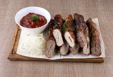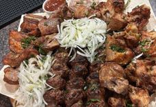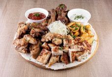 1850 г • каре ягненка, люля-кебаб из баранины, мякоть баранины, овощи на гриле, картофель по-деревенски, лук маринованный, чесночный соус, острый соус