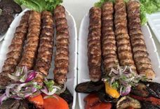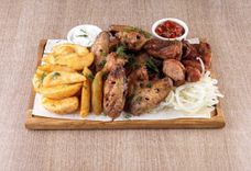 1900 г • люля-кебаб куриный, люля-кебаб свиной, люля-кебаб бараний, картофель по-деревенски, соус чесночный, лук маринованный