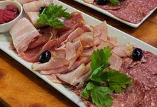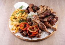 1600 г • свиная шея, ребра, полендвица, картофель по-деревенски, чесночный соус, лук маринованный, зелень