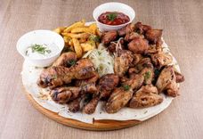 1800 г • куриное бедро, куриное филе, куриные крылышки, картофельные дольки, соус чесночный, соус острый, зелень, лук маринованный